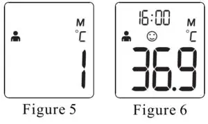 - The Memory Mode can be accessed ether in forehead mode or object mode: When the thermometer has been turned on and followed by Figure 2/4 or finished testing, press and hold the BUTTON for three seconds. The letter M will appear in the center right corner of the display. (See Figure 5)
