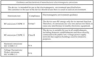 The device satisfies the EMC requirements of the international standard IEC 60601-1-2. The requirements are satisfied under the conditions described in the table below. The device is an electrical medical product and is subject to special precautionary measures with regard to EMC which must be published in the instructions for use. Portable and mobile HF communications equipment can affect the device. Use of the unit in conjunction with non-approved accessories can affect the device negatively and alter the electromagnetic compatibility, The device should not be used directly adjacent to or between other electrical equipment.