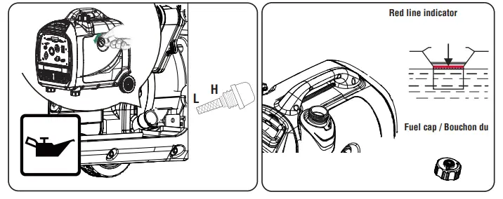 - Use a funnel to pour provided engine oil into engine. Fill to the upper mark of the oil dipstick H.