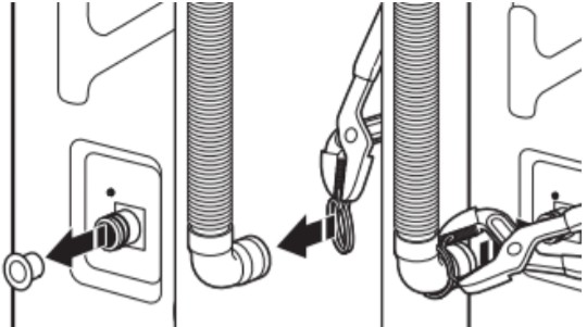 If the clamp is not already in place on the elbow end of the drain hose, slide it over the end as shown. Squeeze clamp with pliers and slide black elbow end of drain hose onto black drain port and secure with clamp.