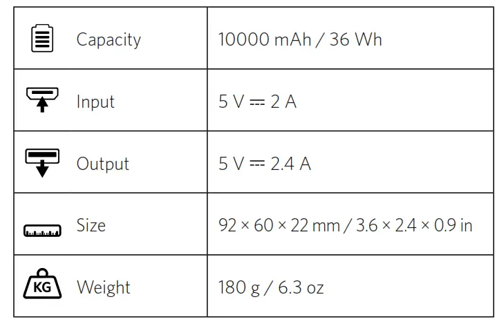 The four LEDs indicate the charging progress. Once the power bank is fully charged, all four LEDs will shut off. A full charging cycle takes about 6-7 hours, depending on the chosen power source (e.g. 5V/2A power charger).