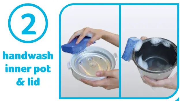 Handwash the lid, inner pot, and accessories with a non-abrasive sponge and soap.