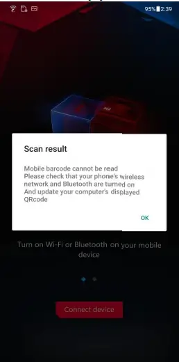 Connecting to the laptop via mobile device but the app shows “Mobile barcode cannot be read. …”