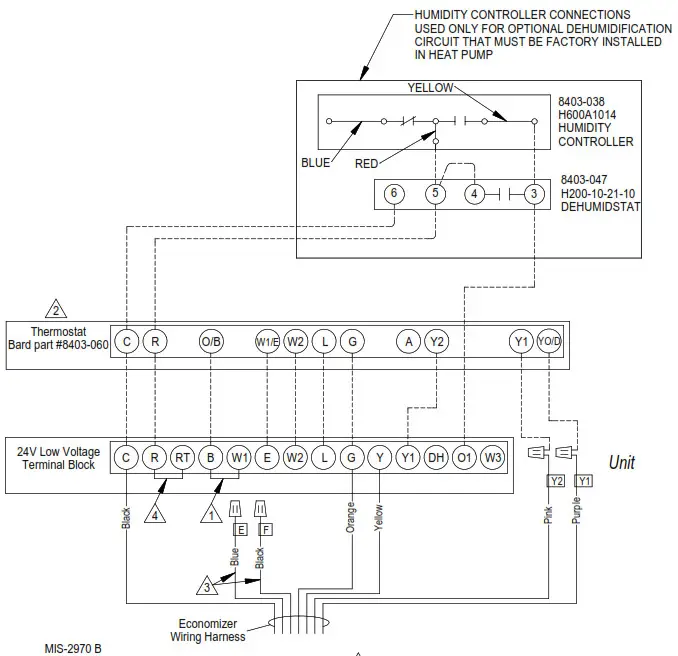 “W3” terminal is the dehumidification input. This terminal energizes the compressor, blower, and threeway valve. This applies only to models equipped for dehumidification