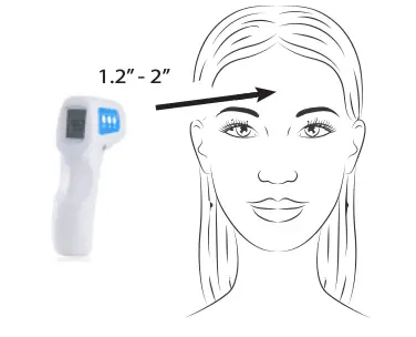 2. Position the thermometer between 1.2″ to 2″ (3 to 5 cm) from the patient’s forehead.