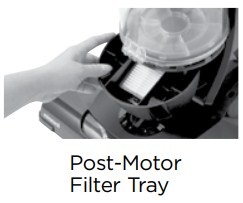 2. The post-motor filter assists in the filtration process to return clean air to the room. Replace the post-motor filter every three to six months. To access the post-motor filter, remove the filter tray located below the Easy Empty dirt tank. When the filter becomes dirty, push the filter through the bottom of the tray to clean or replace the filter.