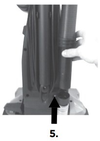 5. Remove the screw attaching the hose wand base to the vacuum. Straighten the hose wand base and check for clogs with a long, narrow object such as a broom stick. Do not use sharp objects like a clothes hanger, as these may puncture the hose.