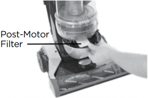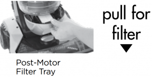 2. The post-motor filter assists in the filtration process to return clean air to the room. Replace the post-motor filter every three to six months. To access the post-motor filter, remove the filter tray located below the Easy Empty dirt tank. When the filter becomes dirty, push the filter through the bottom of the tray to clean or replace the filter.