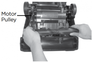 3. Place new drive belt over motor pulley and stretch other end over rotating floor brush in the space between the bristles.