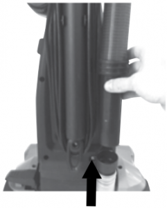 6. Remove the screw attaching the hose wand base to the vacuum. Straighten the hose wand base and check for clogs with a long, narrow object such as a broom stick. Do not use sharp objects like a clothes hanger, as these may puncture the hose.