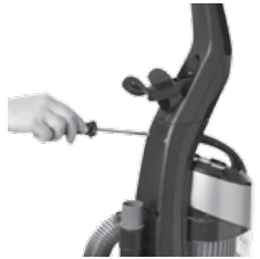 4. Insert the two screws from the screw packet into the existing holes. Push each screw firmly into the hole before beginning to secure the screw with a Phillips head screwdriver. If the handle is aligned properly on the vacuum base, you should be able to push the screw almost entirely into the hole until only the screw head is visible. Tighten the screw with a Phillips head screwdriver by rotating the screw clockwise.