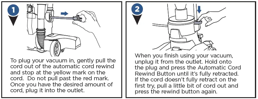 - To plug your vacuum in, gently pull the cord out of the automatic cord rewind and stop at the yellow mark on the cord. Do not pull past the red mark. Once you have the desired amount of cord, plug it into the outlet.