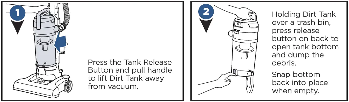 - Holding Dirt Tank over a trash bin, press release button on back to open tank bottom and dump the debris.