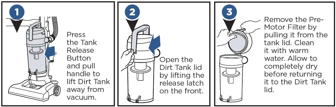 - Press the Tank Release Button and pull handle to lift Dirt Tank away from vacuum.