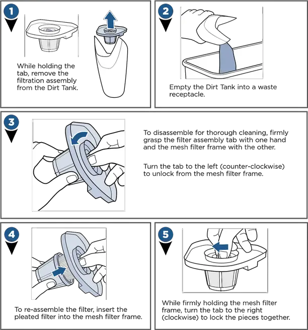 Firmly grasp the tab and pull up to remove the filter from the Dirt Tank. Empty the Dirt Tank into a wastebasket.