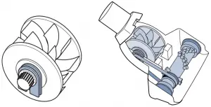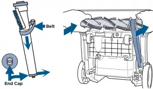 - Replace the Brush Roll and Belt by looping the Belt over the motor shaft and the Brush Roll. Line up the end caps and pull the brush forward into place. This will stretch the Belt. Return bottom cover back on and replace the screws.