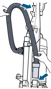 - Remove the Stretch Hose from the back of the vacuum by twisting it to the left. Remove any debris that may have gotten clogged.