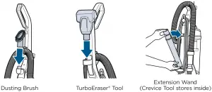 NOTE: The Crevice Tool is stored inside the Extension Wand. Pet Hair Fabric Tool does not store on board.