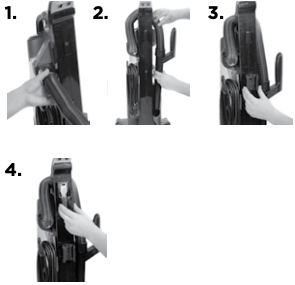 Attach the Twist n’ Snap™ hose by lining up the tabs on the hose cuff with the corresponding notches on the back of the vacuum. Twist the hose cuff clockwise to lock the hose into place.- Fold the hose over the upper hose wrap and slide the end of the hose wand into the hose wand base.