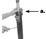 If you need to completely remove the handle for transporting, insert a small screwdriver into the hole to depress the button and press the handle adjustment button down (a) while pulling the handle out.- To re-assemble the handle, insert the handle tube into the main body. (see page 5, “Assembly” for details).