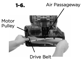 - Place new drive belt over motor pulley and loop other end over rotating floor brush in the space between the bristles.
