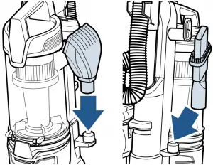 - Press the Dirt Tank Release Button and pull away from vacuum.