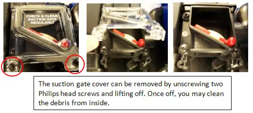 - The suction gate cover can be removed by unscrewing two Philips head screws and lifting off