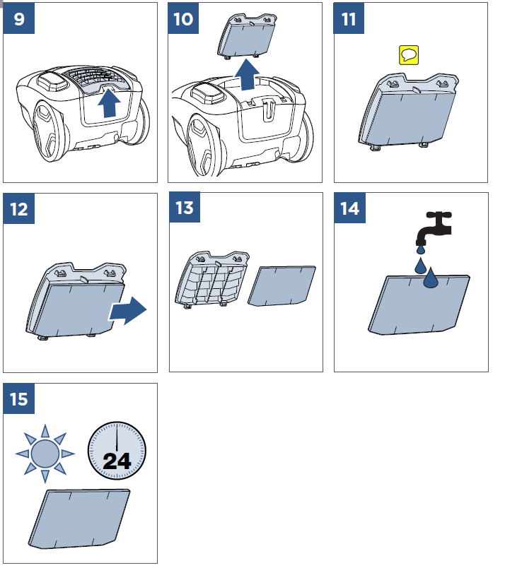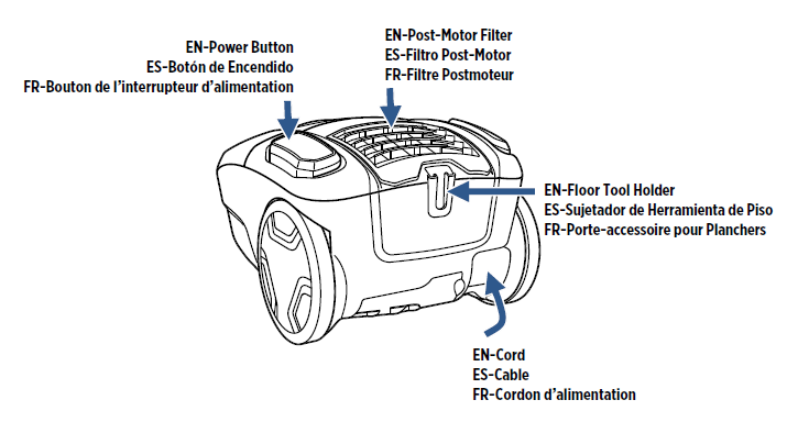 Filters are missing. | Check to see if all of the Pre-Motor and Post-Motor filters are in place. | |