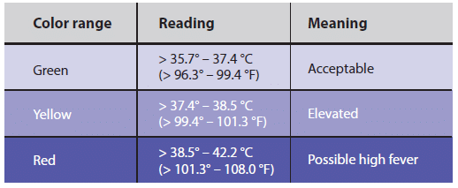 Fever guidance helps you to better understand the meaning of your child’s temperature with the color indicated on the display. The screen displays green if no fever, yellow when the temperature is elevated and a red alert for a possibly high fever. 10 audible beeps indicate temperatures above 37.4 °C (99.4 °F) to alert the user that the patient may have a fever.