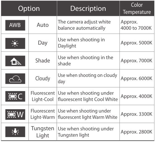 At the default setting of Auto (AWB), the camera automatically adjusts white balance so that a white subject will appear white regardless of the color of the light source. It may however be necessary to match white balance to the light source under mixed lighting or when photographing a subject that is a solid color.