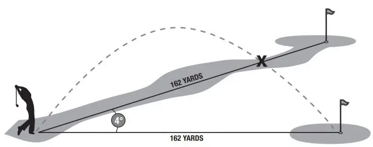 However, if you were to play this hole as 162 yards, the ball (X) would fall short of the hole/flag because you did not take slope into account.