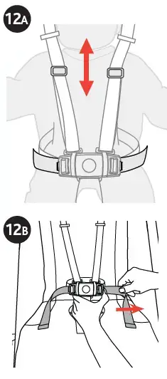 - 12B. The length of the waist straps can be adjusted. Press the tab at the end of the Waist Strap Clip and pull on the strap to tighten or loosen, to better fit your child.