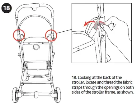 - 18. Looking at the back of the stroller, locate and thread the fabric straps through the openings on both sides of the stroller frame, as shown.