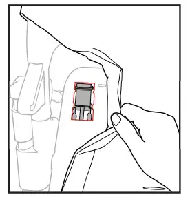 - Undo the harness buckle. Pull the Crotch Strap through the opening on the seat fabric. Fold the strap and place it into the storage compartment under the fabric, as shown.