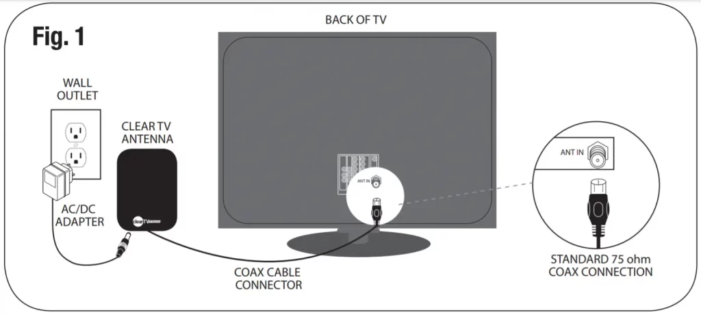 Attach the mini coax cable, which is the small black cable coming from the antenna. Simply screw the connector into the ANTENNA IN or CABLE IN port on the back of your television (See Fig. 1).