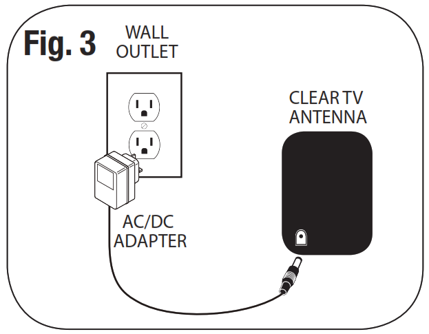 Attach the end of the UL listed power adapter to the power jack located on the lower-left corner of the antenna. Plug power adapter into a 120v Ac outlet (See Fig. 3).