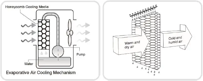 The air cooler cools the air by means of evaporation. When water evaporates into the air, the result is a mixture of air and water molecules. This chemical change requires heat which is taken from the water molecules, resulting in a spot cooling effect.
