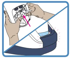 Fit the water chamber to the unit by pressing down the finger guard and sliding the chamber on, carefully aligning with the blue chamber portends.