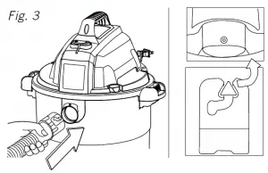 - Insert the larger end of the hose 13 into the vacuum port on the collection tank 8 and lock into place. Fig. 3.