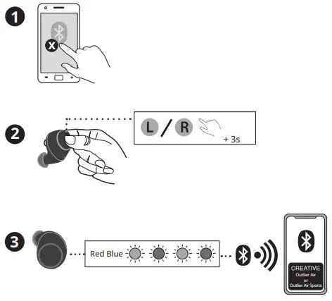 Note: To pair the earbuds to another device, ensure that Bluetooth is OFF on the paired device, then press and hold the main earbud for three seconds.