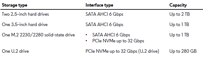 - One M.2 2242/2260/2280 solid-state drive, one 3.5-inch hard drive, and two 2.5-inch hard drives