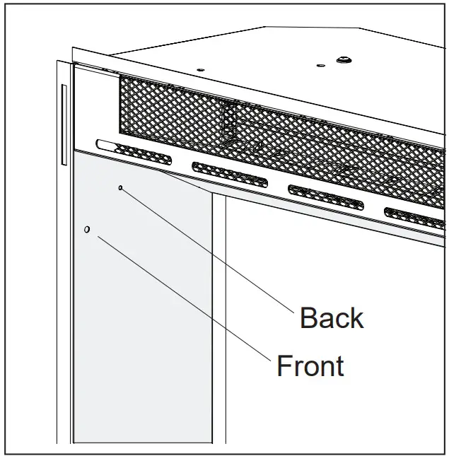 4. 2b. If installing into a custom mantel, or into an existing opening, secure the firebox by inserting an appropriate screw through either the front hole or back hole on the inside face of the firebox, depending on which location is more appropriate for the installation.