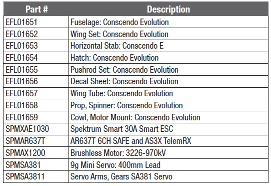 EFL Conscendo 1.5m BNF Basic and PNP, EFL01650 Horizon Hobby, LLC hereby declares that this product is in compliance with the essential requirements and other relevant provisions of the RED and EMC Directives.