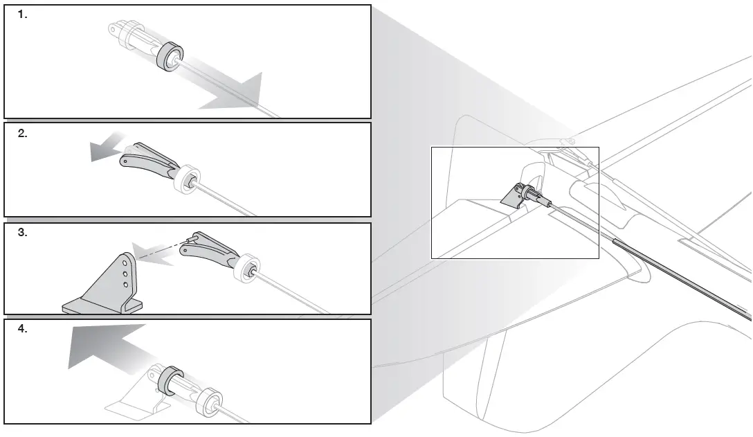- Install the 2 piece (left and right) horizontal stabilizer as shown. Ensure the control horn faces down.