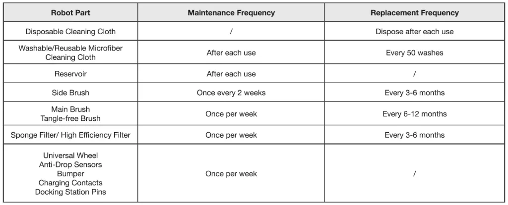 To keep DEEBOT running at peak performance, perform maintenance tasks and replace parts with the following frequencies: