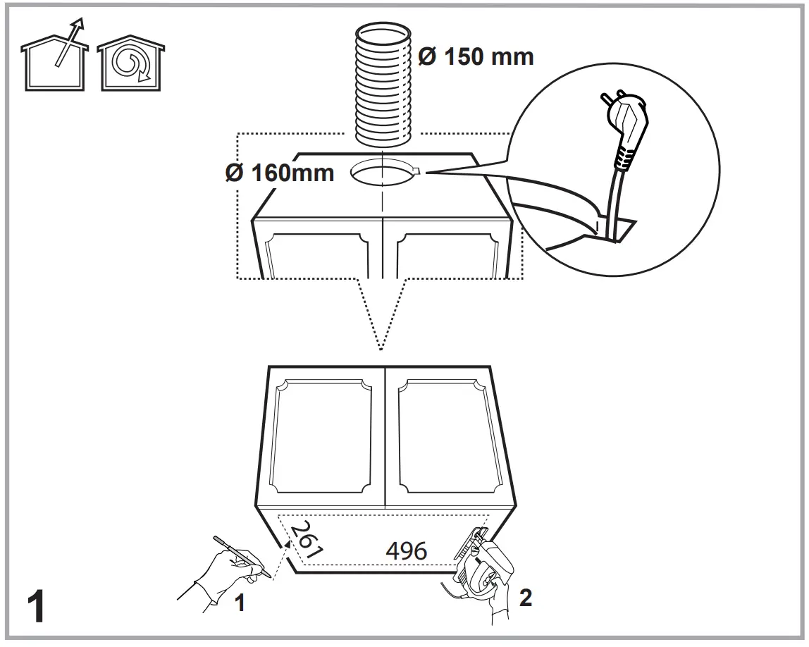 • The minimum distance between the supporting surface for the cooking equipment on the hob and the lowest part of the range hood must be not less than 60cm from electric cookers and 65cm from gas or mixed cookers.
