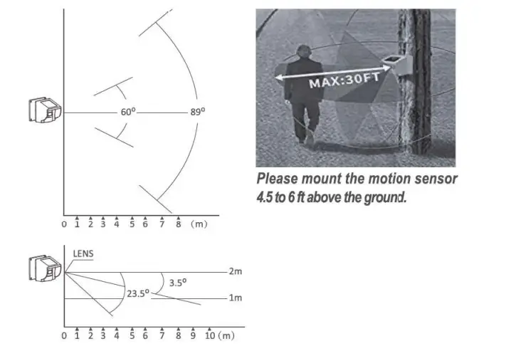 - Mount the waterproof P.I.R. motion sensor vertically on a solid surface 4.5-6 feet (1.5-2m) above the ground and make sure the detected object is within 30 feet when the sensitivity is set to High. Please refer to below for the installation height and detection angle.