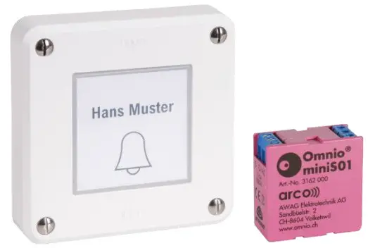 The Omnio starter set N° 61: doorbell is a preconfigured set for switching electrical loads. It can be installed without further configuration. The set consists of an Omnio switching actuator miniS01 and n Omnio wall-mounted transmitter S-CH102, which is already programmed with the function S04 On-impulse. Its non-isolated 230 V~ output is able to be controlled by up to 50 Omnio radio transmitters.