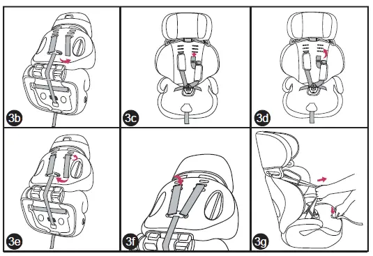 - Reinsert the harness straps through proper slots (3d). Make sure both straps are at the same level and are not twisted.