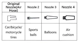 - Make sure the battery has enough power and the item you want to inflate before using and choose the right nozzle.
